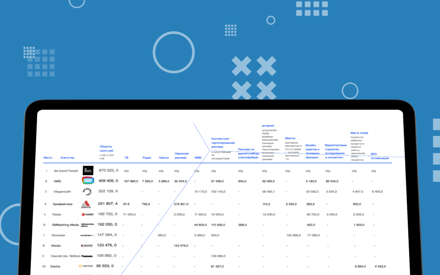 В общей таблице рейтинга организаторы поставили своей задачей свести воедино всю рекламную индустрию региона, однако предусмотрели и несколько срезов по направлениям деятельности.