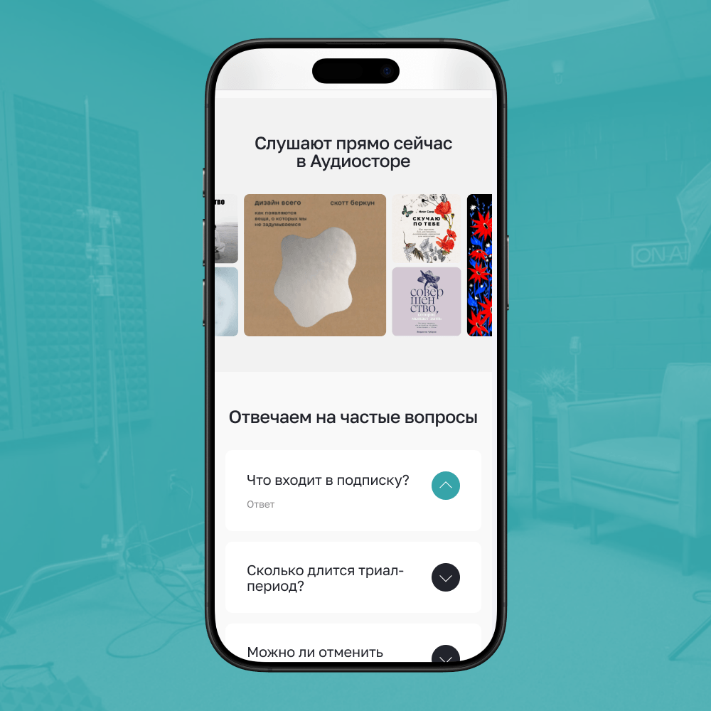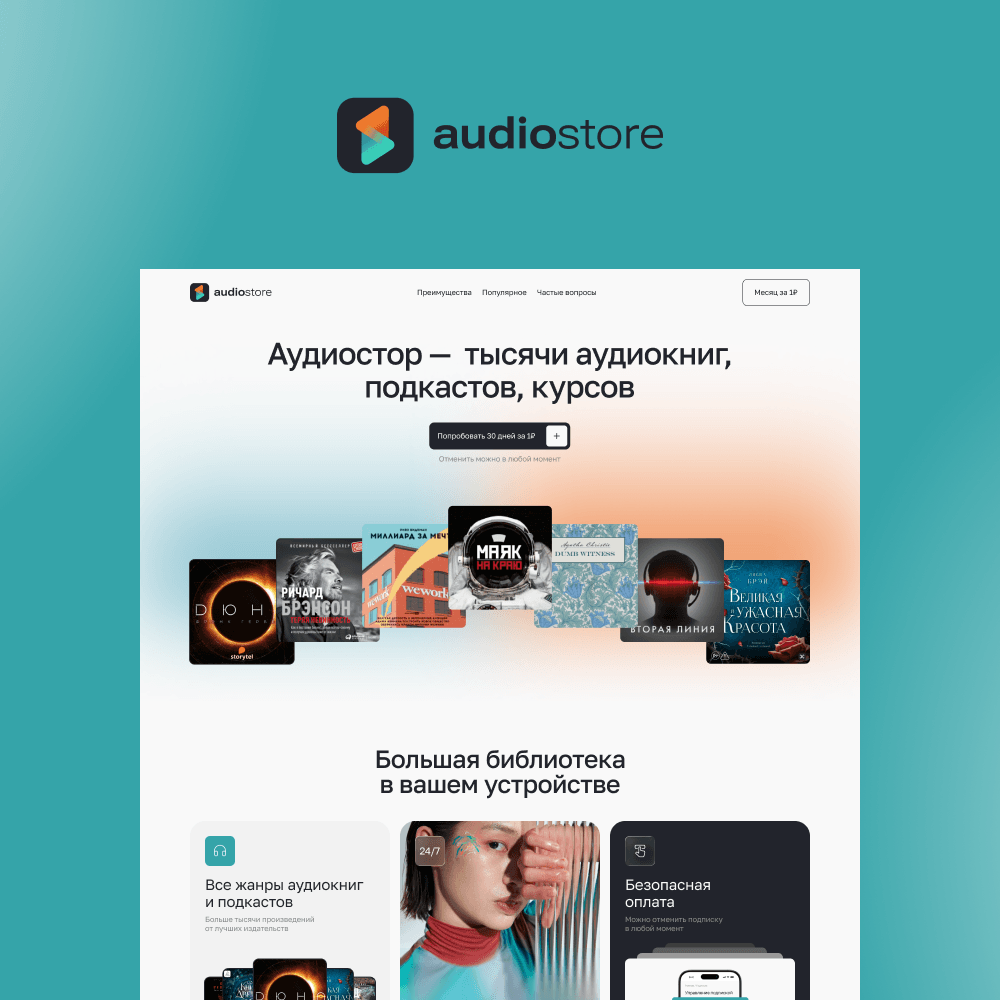 Сайт получился чистым за счет нейтрального фона и аккуратных акцентов. При этом ярким за счет разных категорий аудиоформатов и такого сочетания обложек, чтобы цвета не повторялись 😎