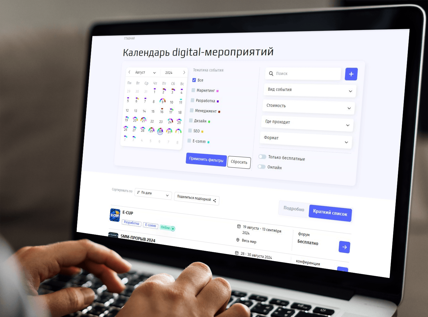 Представляем вам диджитал-календарь — сервис, который собрал все ключевые конференции в таких сферах, как маркетинг, программирование, менеджмент, дизайн, SEO и e-commerce. Это самый масштабный и полный календарь диджитал-мероприятий в России, созданный специально для тех, кто стремится быть в курсе профессиональных событий и постоянно расширять свои знания и связи.
