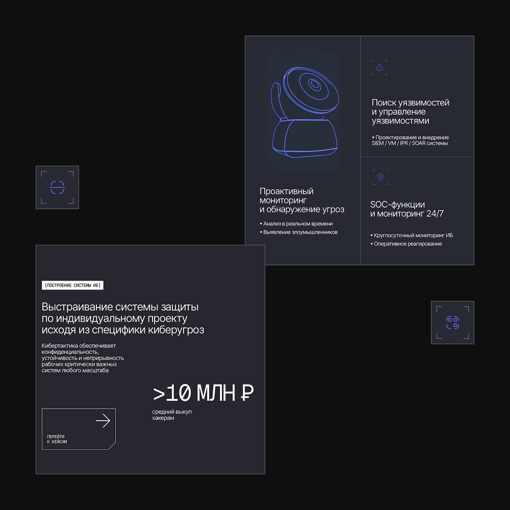 Направление проекта актуальное само по себе и вместе с тем интересное для дизайнеров, потому что сложно передать образ кибербезопасности через визуал. Мы хотели прийти к уникальному дизайну, поэтому еще на этапе концепции проанализировали 200 сайтов и поняли, что заезжено, а что нет.