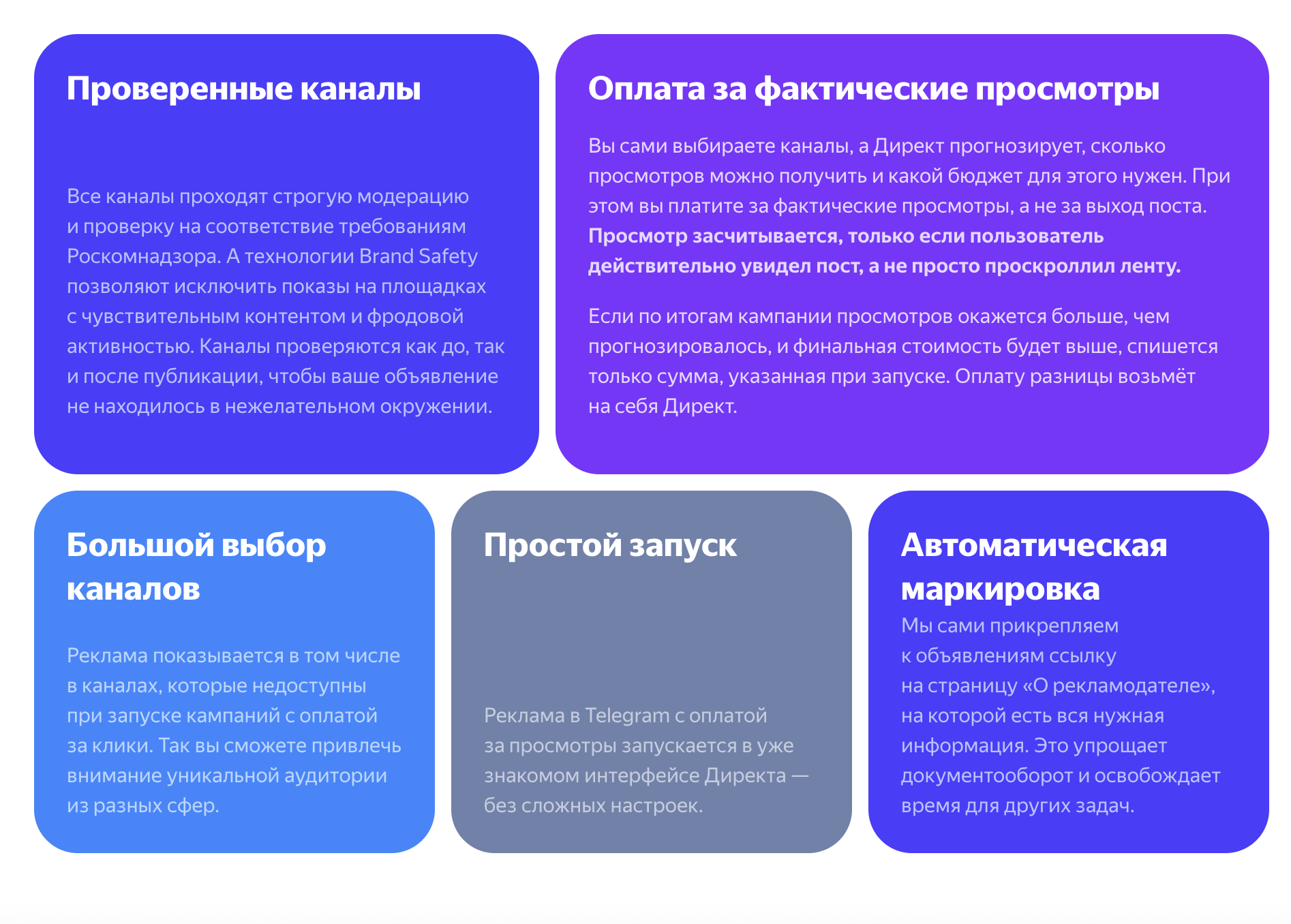Формат «Пост в телеграм-каналах» позволяет запускать продвижение в каналах, которые вы сами выбираете, а также платить за просмотр постов.