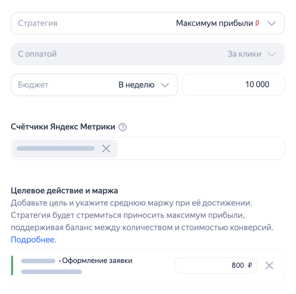В настройках стратегии необходимо заполнить цель, например, оформление заказа или заполнение формы заявки, а также указать среднюю маржу, которую приносит достижение этой цели без учета маркетинговых расходов.