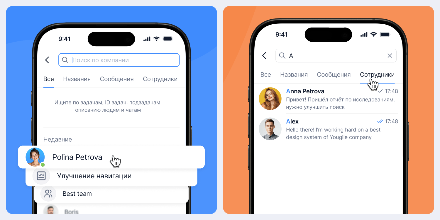 А именно на «Задачи», «Сообщения», «Сотрудники». Не нужно листать общую выдачу в поисках нужного файла.