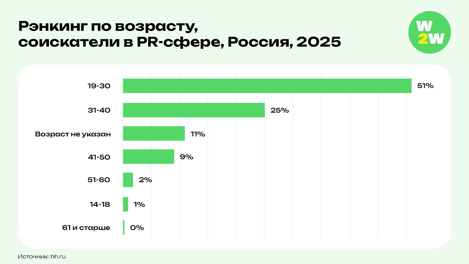 51% соискателей в сфере связей с общественностью – в возрасте от 19 до 30 лет. Для сравнения, в ИТ-сфере доля соискателей от 19 до 30 лет составляет порядка 24% от всего объемна резюме в отрасли, на сферу искусства, культуры и масс-медиа еще меньше - 19,7%. Таковы данные совместного исследования платформы онлайн-рекрутинга hh.ru и коммуникационного агентства Win2Win Communications ко Дню PR-специалиста, который отмечается 28 июля.