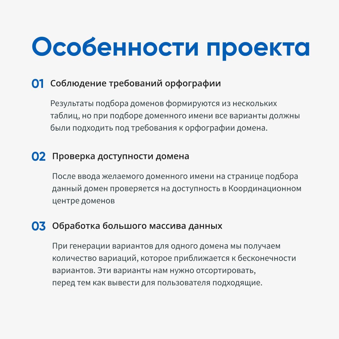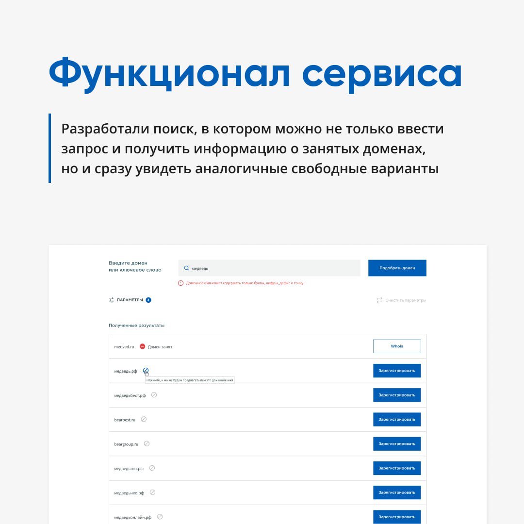 → Создали удобный и стабильно работающий сервис подбора доменных имен в верхнем уровне, который показывает занятые доменные имена и предлагает подобные запросу свободные доменные имена.