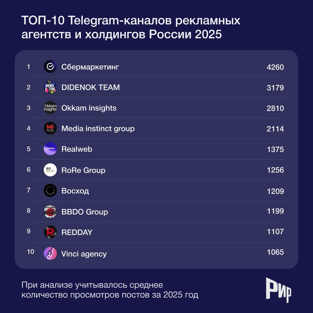 Тelegram-канал СберМаркетинга занял первое место в ТОП-10 каналов рекламных агентств и холдингов России по итогам 2025 года. Рейтинг, основанный на среднем количестве просмотров публикаций за год, представил официальный канал ассоциаций АКАР, АРИР и РАМУ — «Рекламная индустрия России».