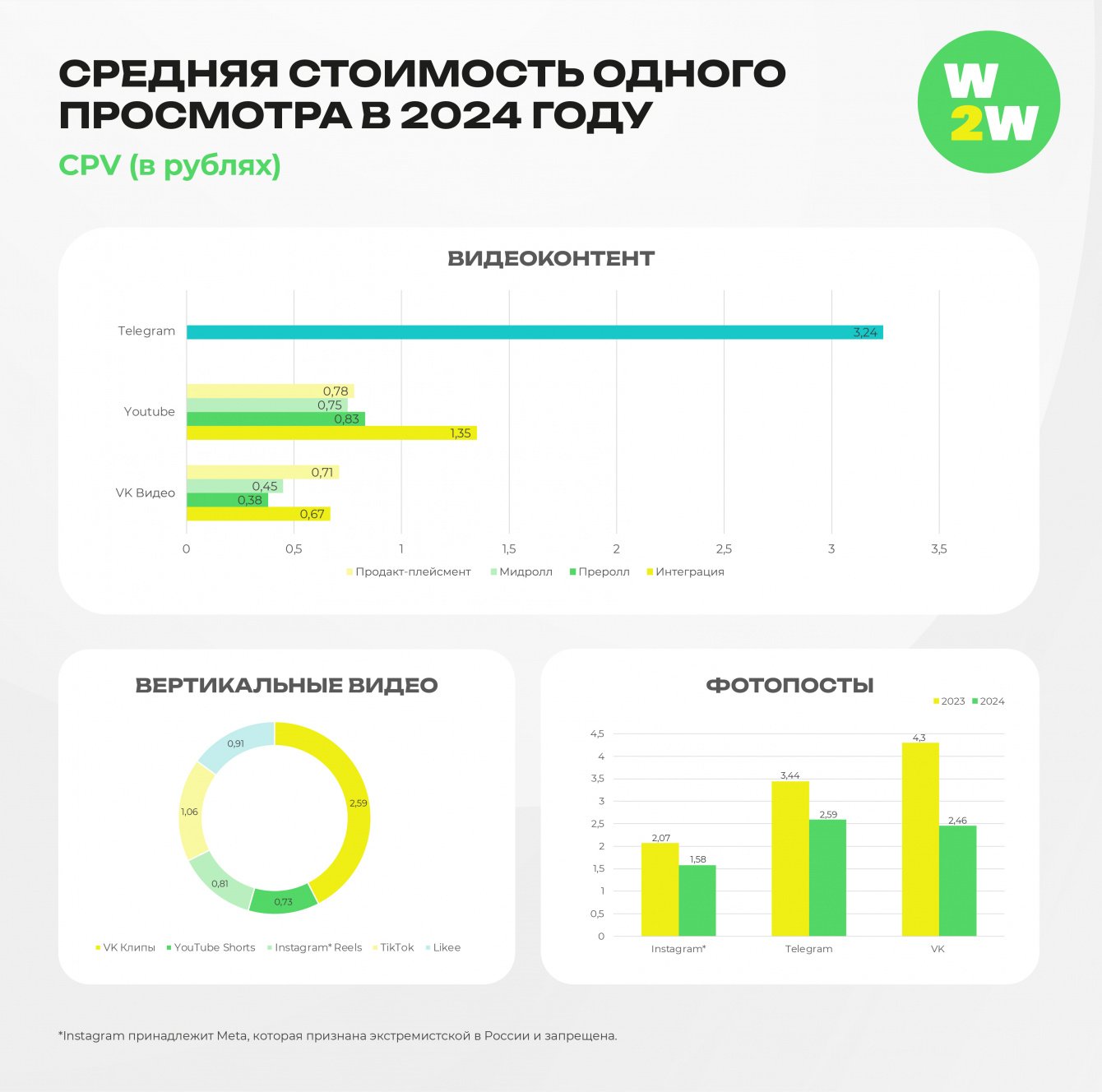 В Telegram наблюдается взрывной рост по предложению видеопостов среди инфлюенсеров: если в 2023 году их предлагали 43,5% блогеров, то в 2024 – уже 73,9%, средняя стоимость одного просмотра составила (CPV) 3,24 рубля , упав на 43% по сравнению с 2023 годом. В 2024 году наблюдается общий тренд - снижение CPV у блогеров, но их доход по сравнению с 2023 годом растет за счёт бОльшего количества проектов со стороны рекламодателей. В результате инфлюенсеры стали зарабатывать больше, а для рекламодателя цена за просмотр стала ниже. Такие данные были получены в ходе третьего ежегодного исследования коммуникационного агентства Win2Win Communications, охватившего более 1,8 тыс. профилей блогеров в Telegram, VK, YouTube, Instagram*, TikTok и Likee. В выборку вошли все категории инфлюенсеров – от нано- до топовых блогов, которые посвящены разным тематикам.