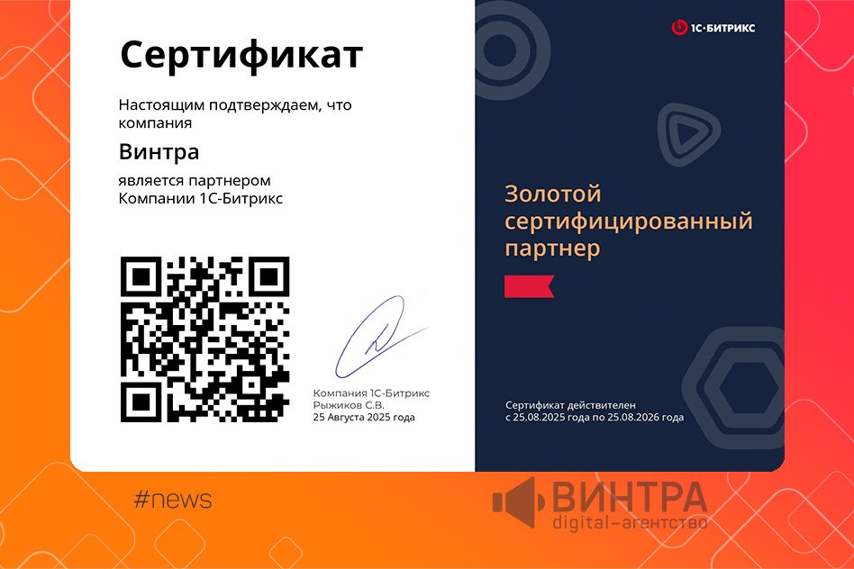 25 августа 2025 «Винтра» получило обновленный сертификат Золотого сертифицированного партнера «1С-Битрикс»!