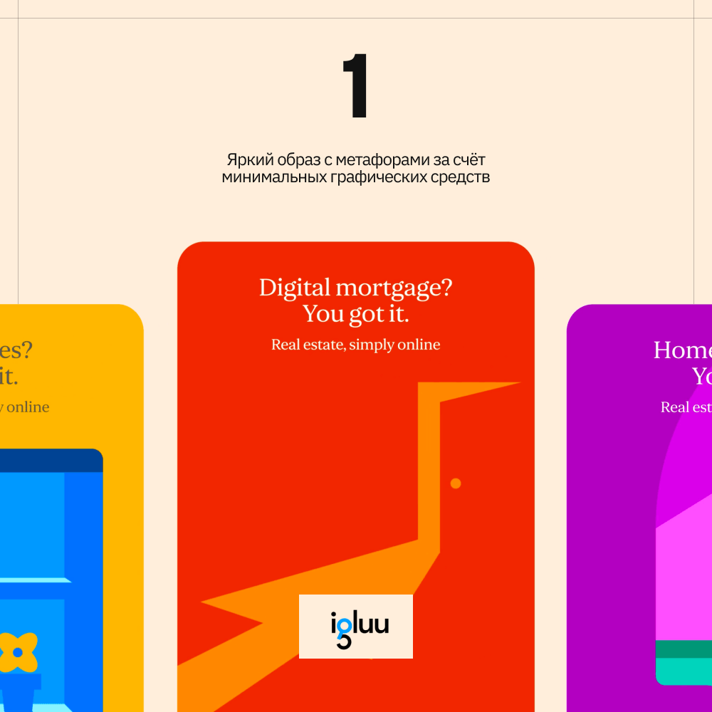 Кейс сервиса недвижимости, который цепляет своей простотой и самобытностью. Минимум графических усилий, но при этом очень цельный, яркий и узнаваемый образ. Хороший пример того, как можно передать эмоции через нетривиальные образы, при этом не перегружая визуал.